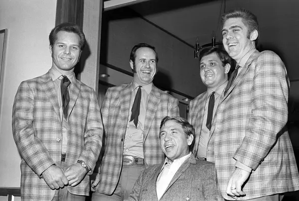 Buck Owens og hans band The Buckaroos gjester Oslo. Pressekonferanse på Hotel Continental. Buck sittende i midten.