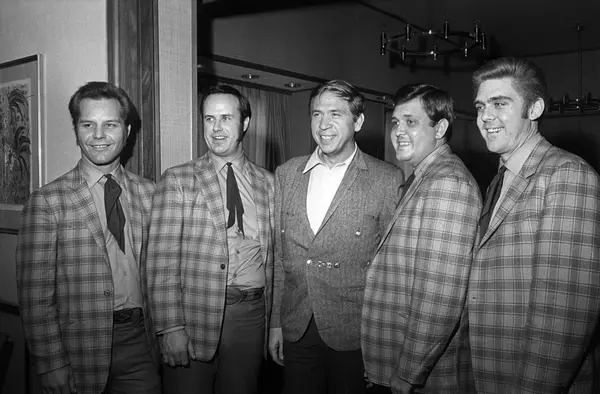 Buck Owens og hans band The Buckaroos gjester Oslo. Pressekonferanse på Hotel Continental. Buck i midten.