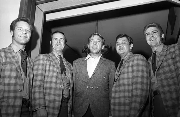 Buck Owens og hans band The Buckaroos gjester Oslo. Pressekonferanse på Hotel Continental. Buck i midten.
