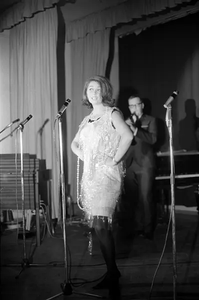 Dizzie Tunes skal på turné med revyen "Åh, så heldige vi er" sammen med Wenche Myhre og Ivar Medaas. Her er Wenche under generalprøven i Keysers gate i Oslo.