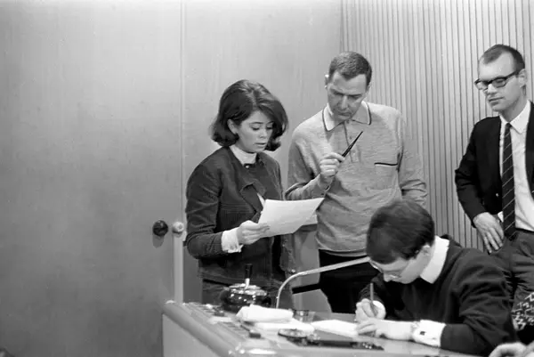 Wenche Myhre under innspilling av plata "Love a-go-go". Plata blir spilt inn hos Roger Arnhoff. Her er Wenche sammen med platedirektør Totto Johannessen i midten. Ukjente personer til høyre.