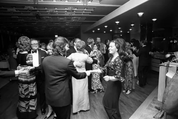 Ny revy på Chat Noir "Show før, jo heller" med Wenche Myhre og Dizzie Tunes. Her fra premierefesten. Til venstre danser Øyvind Klingberg i Dizzie Tunes og i forgrunnen danser antatt Finn Eriksen med ryggen til.