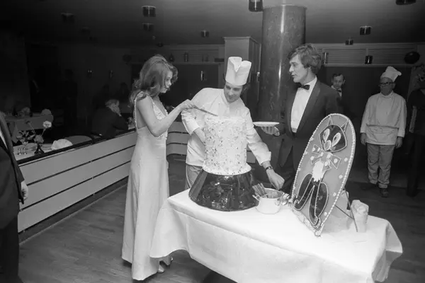 Ny revy på Chat Noir "Show før, jo heller" med Wenche Myhre og Dizzie Tunes. Her fra premierefesten. Wenche Myhre til venstre forsyner seg med kake sammen med show-arrangør Jørg Fr. Ellertsen til høyre.
