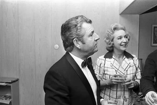 Den engelske skuespilleren Kenneth More er i Oslo. Her møter han hovedaktørene i musikalen "Cabaret" på Oslo Nye Teater i pausen. Wenche Foss sammen med More på teatersjefens kontor.