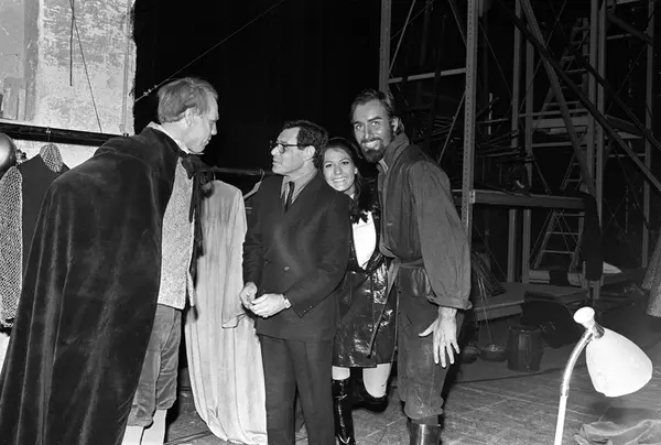 Sanger og skuespiller Eddie Fisher besøker Norge sammen med sin norske forlovede Ida Bjørn-Hansen. Etter forestillingen "Mannen fra La Mancha" på Det Norske Teatret, treffer Fisher Lasse Kolstad (til venstre) bak scenen. Bjørn-Hansen sammen med ukjent skuespiller til høyre.