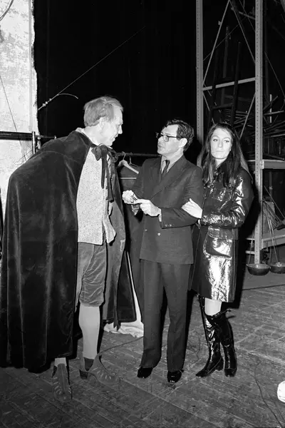 Sanger og skuespiller Eddie Fisher besøker Norge sammen med sin norske forlovede Ida Bjørn-Hansen. Etter forestillingen "Mannen fra La Mancha" på Det Norske Teatret, treffer de Lasse Kolstad (til venstre) bak scenen.