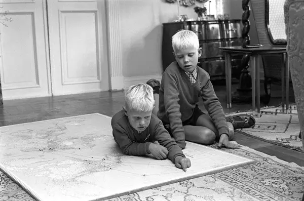 Familien Damman har kommet hjem etter å ha bodd sju måneder på øya Savali i Polynesia. Her er to av guttene, antatt Are og Brede, som viser på kartet hvor de har vært.