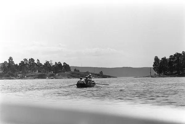 Erik Damman, reklamekonsulent fra Oslo, ferierer i båt med familien i Oslofjorden. De skal ro 10 - 12 mil i løpet av 8 - 10 dager, og går i land på små holmer som fjorden har mange av. Her er Rein (10), Erik Damman, Brede (5), Are (8), Ranghild Damman og mintemann Jaran (1,5) samlet i båten.