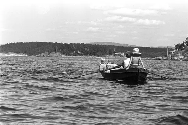 Erik Damman, reklamekonsulent fra Oslo, ferierer i båt med familien i Oslofjorden. De skal ro 10 - 12 mil i løpet av 8 - 10 dager, og går i land på små holmer som fjorden har mange av. Her har Erik Damman gått i vannet. Ragnhhild Damman sitter ved årene sammen med Are (8), Brede (5) og Rein (10) forut i båten.