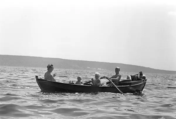 Erik Damman, reklamekonsulent fra Oslo, ferierer i båt med familien i Oslofjorden. De skal ro 10 - 12 mil i løpet av 8 - 10 dager, og går i land på små holmer som fjorden har mange av. Her sitter Erik Damman ved årene. Ragnhild Damman til venstre. Midt i båten Are (8), Brede (5) og Rein (10) helt forut.