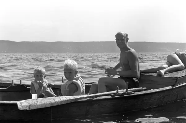 Erik Damman, reklamekonsulent fra Oslo, ferierer i båt med familien i Oslofjorden. De skal ro 10 - 12 mil i løpet av 8 - 10 dager, og går i land på små holmer som fjorden har mange av. Her sitter Erik Damman ved årene sammen med Are (8), Brede (5) og Rein (10) helt forut.
