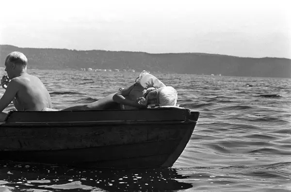 Erik Damman, reklamekonsulent fra Oslo, ferierer i båt med familien i Oslofjorden. De skal ro 10 - 12 mil i løpet av 8 - 10 dager, og går i land på små holmer som fjorden har mange av. Her sitter Erik Damman ved årene. Rein (10) har lagt seg ned på "soldekket" forut.