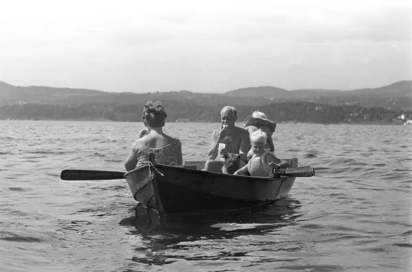 Erik Damman, reklamekonsulent fra Oslo, ferierer i båt med familien i Oslofjorden. De skal ro 10 - 12 mil i løpet av 8 - 10 dager, og går i land på små holmer som fjorden har mange av. Her sitter Erik Damman ved årene. Ragnhild Damman med ryggen til. Midt i båten Brede (5), Are (8) og hunden Rocky. Rein (10) helt forut.