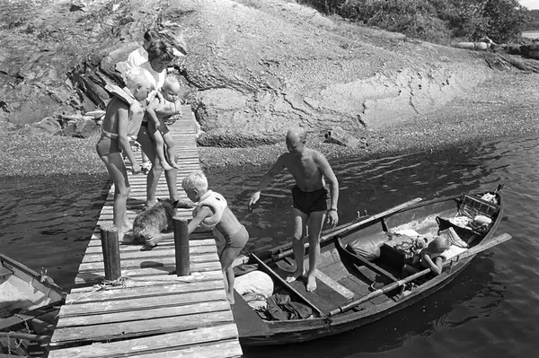 Erik Damman, reklamekonsulent fra Oslo, ferierer i båt med familien i Oslofjorden. De skal ro 10 - 12 mil i løpet av 8 - 10 dager, og går i land på små holmer som fjorden har mange av. Like før avreise fra Brønnøya. Ragnhild Damman på brygga med Jaran (1,5) og Rein (10). Are (8) med hunden Rocky. I båten Erik Damman og Brede (5).