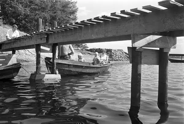 Erik Damman, reklamekonsulent fra Oslo, ferierer i båt med familien i Oslofjorden. De skal ro 10 - 12 mil i løpet av 8 - 10 dager, og går i land på små holmer som fjorden har mange av. Like før avreise fra Brønnøya. Ragnhild Damman i båten med Jaran (1,5). I midten Are (8) og Brede (5). Erik Damman med ryggen til.