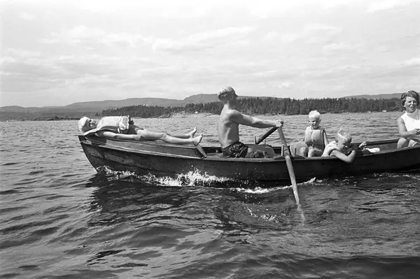 Erik Damman, reklamekonsulent fra Oslo, ferierer i båt med familien i Oslofjorden. De skal ro 10 - 12 mil i løpet av 8 - 10 dager, og går i land på små holmer som fjorden har mange av. Erik Damman ved årene. Ragnhild Damman sammen med Are (8) og Brede (5). Rein (10) ligger på soldekket forut.