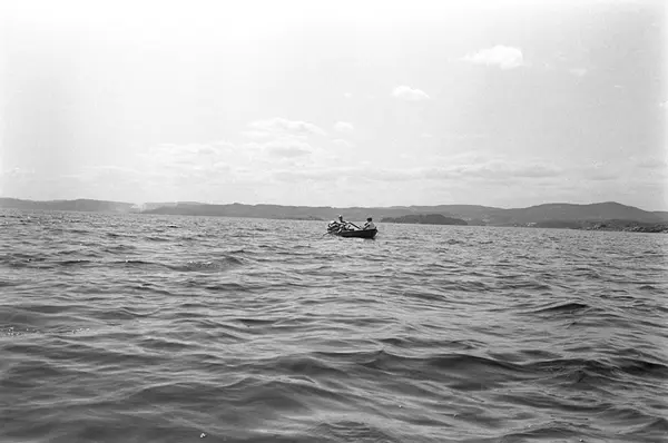 Erik Damman, reklamekonsulent fra Oslo, ferierer i båt med familien i Oslofjorden. De skal ro 10 - 12 mil i løpet av 8 - 10 dager, og går i land på små holmer som fjorden har mange av. Erik Damman ved årene. Ragnhild Damman sammen med Are (8) og Brede (5). Rein (10) ligger på soldekket forut.