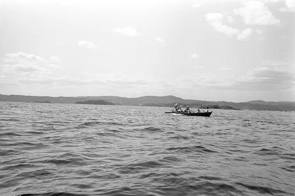Erik Damman, reklamekonsulent fra Oslo, ferierer i båt med familien i Oslofjorden. De skal ro 10 - 12 mil i løpet av 8 - 10 dager, og går i land på små holmer som fjorden har mange av. Erik Damman ved årene. Ragnhild Damman sammen med Are (8) og Brede (5). Rein (10) ligger på soldekket forut.