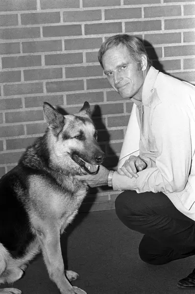 Den amerikanske skuespilleren Charlton Heston har kommet til Norge i forbindelse med opptak til filmen "Når villdyret våkner". Her er han sammen med en schæferhund på pressekonferansen i Oslo.
