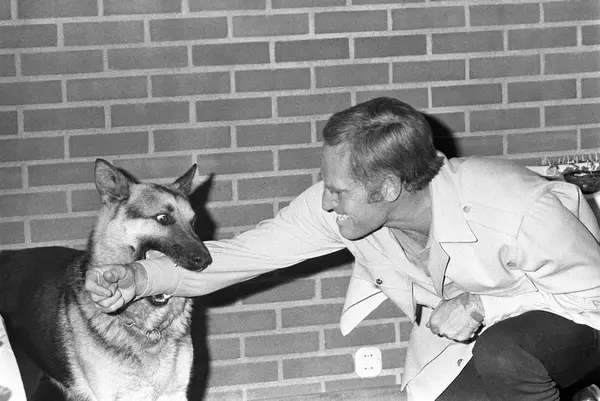 Den amerikanske skuespilleren Charlton Heston har kommet til Norge i forbindelse med opptak til filmen "Når villdyret våkner". Her er han sammen med en schæferhund på pressekonferansen i Oslo.
