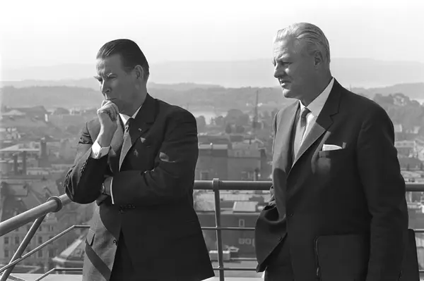Den tyske forbundskansleren Ludwig Erhard er på offisielt besøk i Norge. Her er utenriksminister John Lyng til høyre sammen med tysklands utenriksminister Gerhard Schrõder på terrassen utenfor statsministerens kontor i Regjeringsbygget.