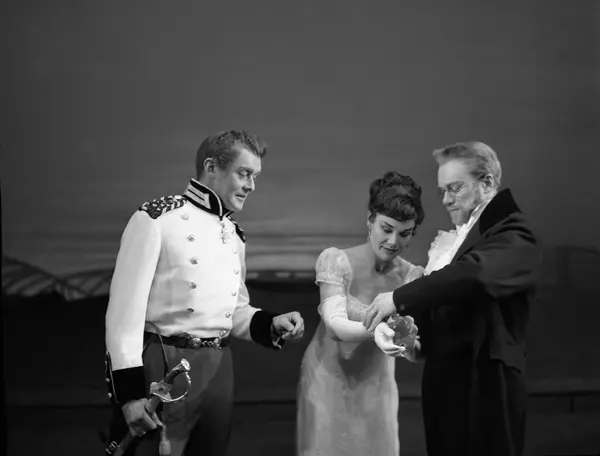 Teaterforestillingen "Krig og Fred" på Nationaltheatret med fra høyre Jørn Ording, Liv Strømsted og Lars Nordrum