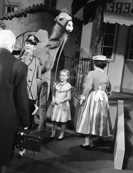 "Folk og røvere" i Kardemomme by" på Nationaltheatret med skuespiller Arne Bang-Hansen som politimester Bastian og skuespiller Kari Sundby som tante Sofie (med ryggen til).