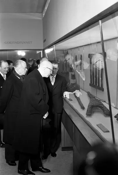 Finlands president Urho Kekkonen (nærmest) er på statsbesøk i Norge. Her blir han vist rundt på Vikingskipsmuseet av professor Bjørn Hougen. Kong Olav helt til venstre.