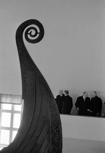 Finlands president Urho Kekkonen til venstre er på statsbesøk i Norge. Her blir presidenten vist rundt av professor Bjørn Hougen (med ryggen til) på Vikingskipsmuseet på Bygdøy sammen med Kong Olav (nr. 2 fra høyre).