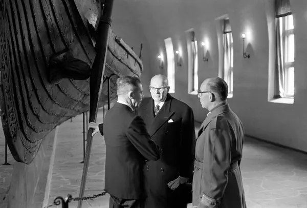 Finlands president Urho Kekkonen (i midten) er på statsbesøk i Norge. Her blir presidenten vist rundt av professor Bjørn Hougen (med ryggen til) på Vikingskipsmuseet på Bygdøy. Ukjent person til høyre.