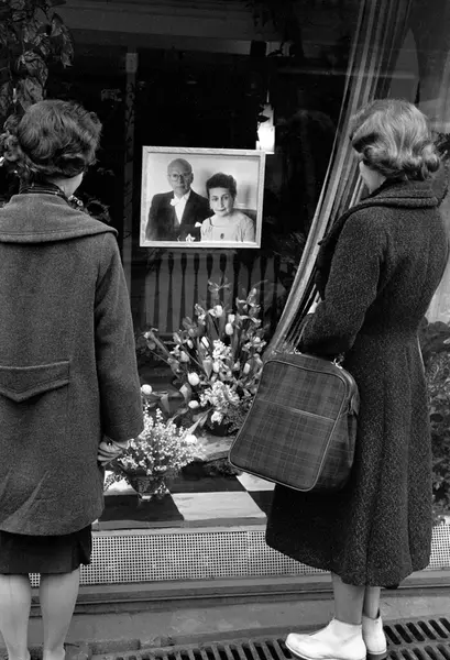 Finlands president Urho Kekkonen på statsbesøk i Norge. I utstillingsvinduet til en blomsterbutikk i Oslo blir han og hans kone Sylvi Kekkonen ønsket velkommen med blomster og bilde. To damer betrakter utstillingsvinduet.