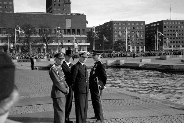 Kong Frederik og Dronning Ingrid på offisielt besøk i Norge. Her venter offiserer fra forskjellige våpengrener på Honnørbrygga på at det danske kongeskipet Danebrog skal legge til kai. Oslo Rådhus i bakgrunnen.