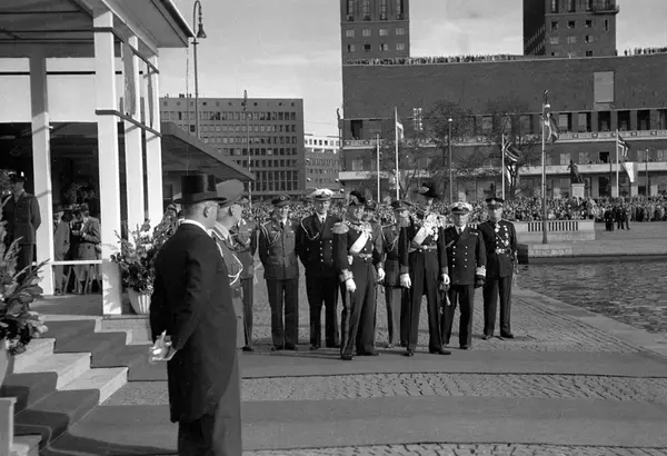 Kong Frederik og Dronning Ingrid på offisielt besøk i Norge. Kronprins Olav og Kong Haakon, begge med snutehatt, venter sammen med offiserer fra forskjellige våpengrener på Honnørbrygga på at det danske kongeskipet Danebrog skal legge til kai. Oslo Rådhus i bakgrunnen.