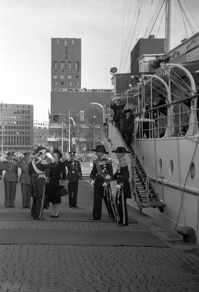 Kong Frederik og Dronning Ingrid på offisielt besøk i Norge. Her ønsker Kong Haakon og Kronprins Olav det danske kongeparet velkommen på Honnørbrygga. Til høyre ligger det danske kongeskipet Danebrog. Kong Haakon, Krong Frederik og Kronprins Olav bærer alle snutehatt.