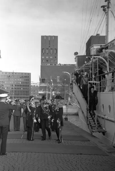 Kong Frederik og Dronning Ingrid på offisielt besøk i Norge. Her ønsker Kong Haakon og Kronprins Olav det danske kongeparet velkommen på Honnørbrygga. Til høyre ligger det danske kongeskipet Danebrog. Kong Haakon, Krong Frederik og Kronprins Olav bærer alle snutehatt.