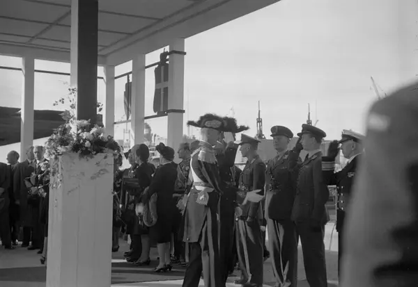 Kong Frederik og Dronning Ingrid på offisielt besøk i Norge. Her hilser kong Frederik på offiserer fra forskjellige våpengrener. Kong Haakon og Kong Frederik bærer begge snutehatt.
