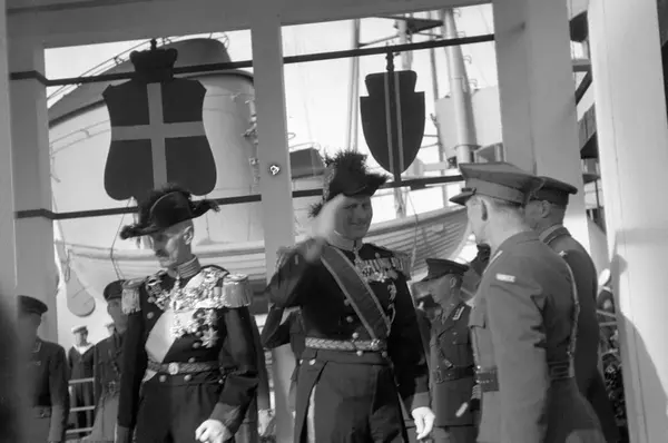 Kong Frederik og Dronning Ingrid på offisielt besøk i Norge. Her hilser kong Frederik på offiserer fra forskjellige våpengrener. Kong Haakon og Kong Frederik bærer begge snutehatt.