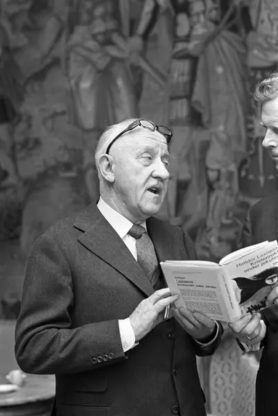 Den islandske forfatteren Haldor Kiljan Laxness er i Oslo i forbindelse med utgivelsen av boka "Kristenrøkt under jøkulen". Til høyre skimtes direktør Ivar Eskeland.