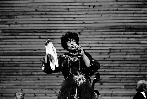 Konsert med Ella Fitzgerald og Flanagan's trio i Njårdhallen. I bakgrunnen fra venstre Ed Thigpen på trommer, Frank de la Rosa på bass og til høyre Tommy Flanagan på flygel.