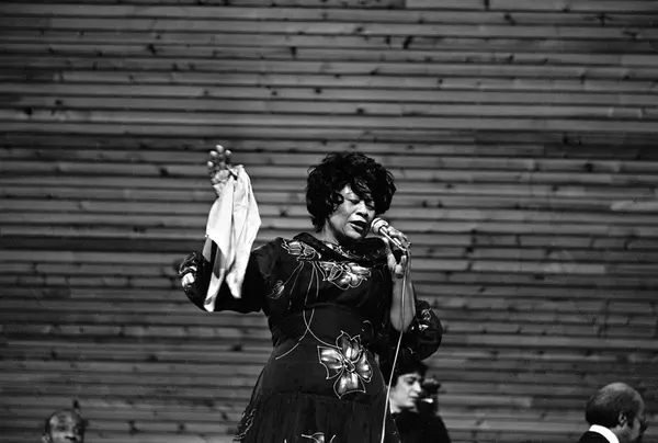Konsert med Ella Fitzgerald og Flanagan's trio i Njårdhallen. I bakgrunnen fra venstre Ed Thigpen på trommer, Frank de la Rosa på bass og til høyre Tommy Flanagan på flygel.