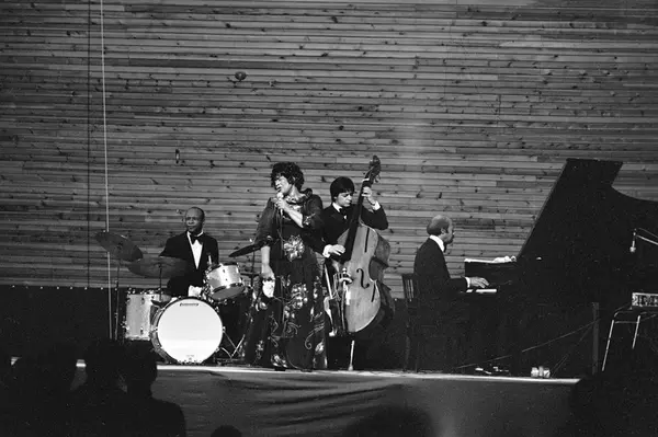 Konsert med Ella Fitzgerald og Flanagan's trio i Njårdhallen. Fra venstre Ed Thigpen på trommer, Ella, Frank de la Rosa på bass og Tommy Flanagan på flygel.