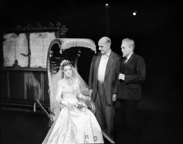 Nationaltheatrets forestilling "Besøk av en gammel dame" med Lillebil Ibsen og Kolbjørn Buøen i midten i hovedrollene. Til høyre står antatt skuespiller Jørn Ording.