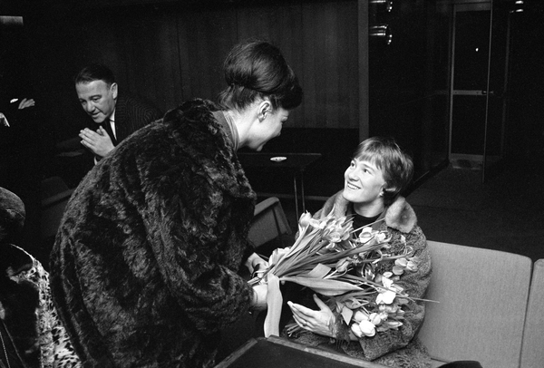 Sjoukje Dijkstra har kommet til Oslo med is-sirkuset Holiday on Ice. Hun har tre verdens- og et olympiamesterskap i kunstløp. Denne dagen fyller hun også 24 år og får blomster av Berit Berg (til venstre) fra Norges Skøyteforbund.