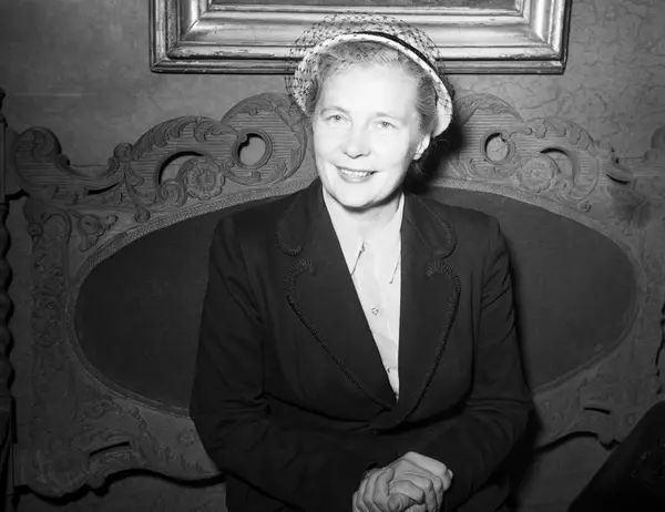 Direktør for UNESCOs avdeling for samfunnsforskning, Alva Myrdal, er i Oslo i forbindelse med et kurs arrangert av Institutt for samfunnsforskning. Her fotografert på Bristol.