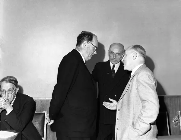 Fra høyre stortingsmann Ingvald Haugen, redaktør Martin Tranmæl og redaktør Axel Zachariassen under en rettssak i Forhørsretten.