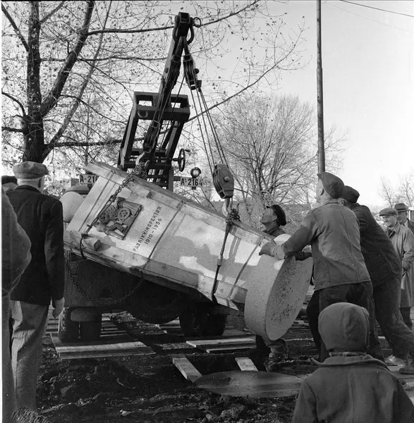 Minnestøtte over Betzy Kjelsberg (1866-1950), Norges første kvinnelige fabrikkinspektør, reises 31.10.1956 ved Vøyenbrua og Marcus Thranes gate, Oslo. Arbeidere og kranbil i aksjon.
