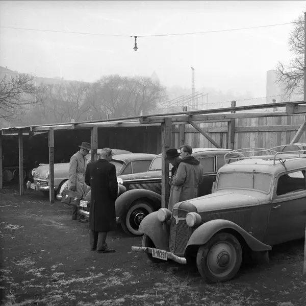 Bil av typen Adler Trumpf ca. 1935-39. Forhjulsdrevet tysk bil, som i 1939 ble montert på Den Norske Automobilfabrikk på Kambo utenfor Moss. Bilene inspiseres på bilauksjon i Nordregate i Oslo.