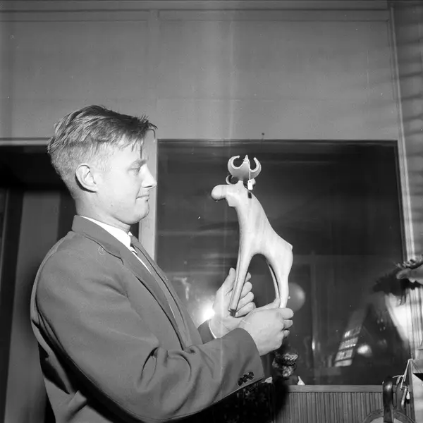 Utstilling av diverse souvenirer, Oslo, 05.08.1958. Souveniren er designet av Arne Tjomsland (1915-70)