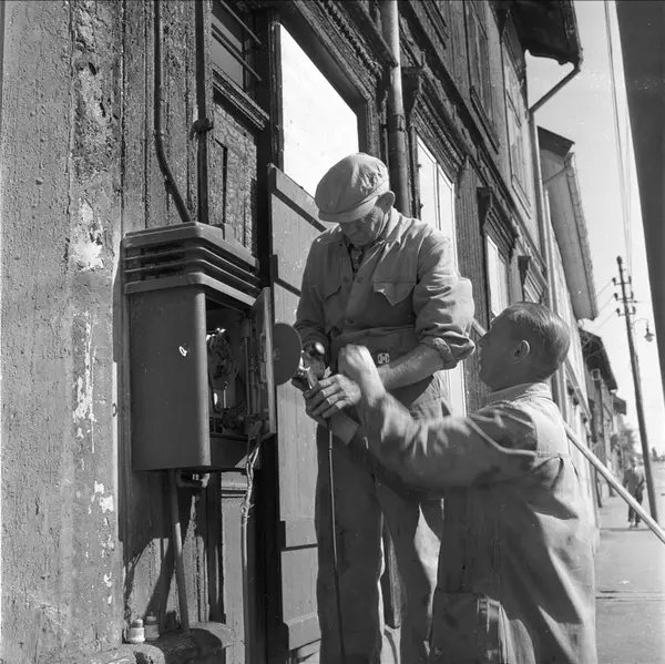 To menn reparerer brannmelderen i Totengata på Vålerenga i Oslo i 1958, etter en tragisk trikkebrann.