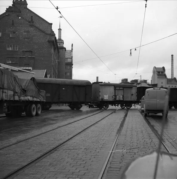 Dette er sidesporet til Slaktehuset som vi ser til høyre. Det lå der Busstasjonen er nå. Krysset var et av to steder i Oslo hvor Jernbanen og Sporveien møttes. De første røde T-banevognene ble overført her og slept til Ryen på sporveisskinnene nattestid på sin vei fra Strømmens Verksted i 1965. Schweigaardsgate i Oslo i 1958.